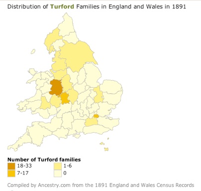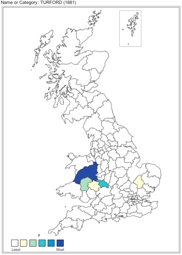 This map shows the spread of Turfords in the UK in 1881